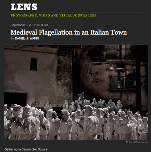 Lens, il blog fotografico del New York Times, oggi si occupa dei flagellanti e dei “Riti settennali di penitenza”, che si tengono – appunto – ogni sette anni a Guardia Sanframondi, in provincia di Benevento. Le processioni iniziano dopo la festa dell’Assunzione (15 agosto) e vi partecipano più di un migliaio tra donne e uomini con una tunica bianca e un cappuccio che copre il volto. Camminano per le viuzze del paese e intanto si percuotono il petto e la schiena con oggetti appuntiti, rito che secondo la tradizione porta a riconciliarsi con Dio attraverso la penitenza.