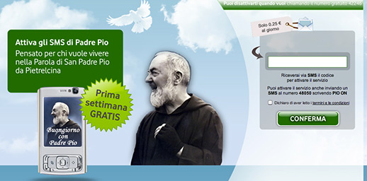 Tu gli molli 0,25 centesimi ogni giorno, e loro ti inviano quotidianamente un SMS con i pensieri del santo. E funziona tutto per miracolo. Per le stimmate via MMS si stanno attrezzando.
