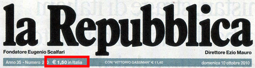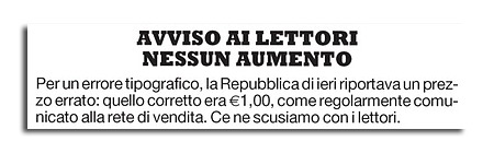 Nella prima pagina di Repubblica di ieri non c’era nemmeno un refuso, in compenso hanno sbagliato a stampare il prezzo del giornale: 1,50 euro invece di 1 euro. Gli edicolanti, quelli onesti, se ne sono accorti controllando le bolle di consegna e hanno chiesto il solito prezzo per l’acquisto del giornale.