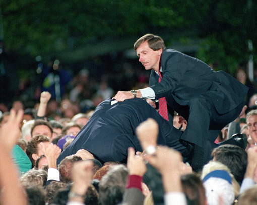 Il tizio preso per i pantaloni da un agente dei servizi segreti è Al Gore. È il 3 novembre del 1992 e siamo a Little Rock in Arkansas. Gore è stato appena eletto vicepresidente degli Stati Uniti nel ticket con Bill Clinton presidente. Tra la folla festante sotto al podio di Gore c’è Jim Carville, lo stratega della campagna elettorale, che riceve un caloroso e acrobatico abbraccio da parte del neo vicepresidente.