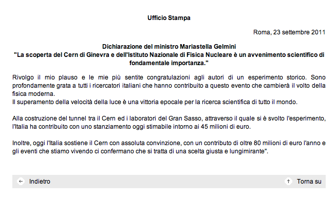 «ovviamente, il tunnel di cui si parla nel comunicato di venerdì, non può essere per nessuna ragione inteso come un tunnel che collega materialmente Ginevra con il Gran Sasso. Questo è di facile intuizione per tutti e la polemica è assolutamente strumentale» […] «Il tunnel a cui si fa riferimento – prosegue la nota – è quello nel quale circolano i protoni dalle cui collisioni ha origine il fascio di neutrini che attraversando la terra raggiunge il Gran Sasso» […] «Questa polemica è dunque destituita di fondamento ed è assolutamente ridicola».