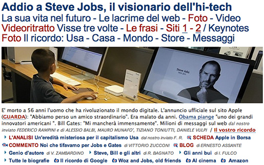Questa è la homepage del sito di Repubblica qualche ora dopo la morte di Steve Jobs, giovedì scorso. Avevo pensato di farne un’analisi, ma alla fine mi sono reso conto che, con soggetti diversi, valgono le cose che avevo scritto tempo fa per i fatti di Utøya. Già.