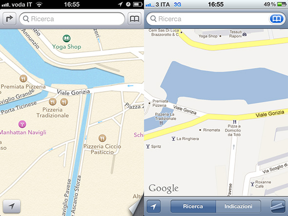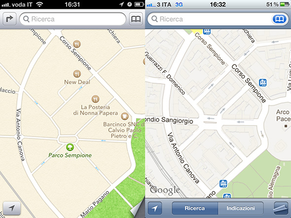 E queste sono le mappe a confronto con le indicazioni dei punti di interesse (di nuovo, a sinistra Apple a destra Google).
